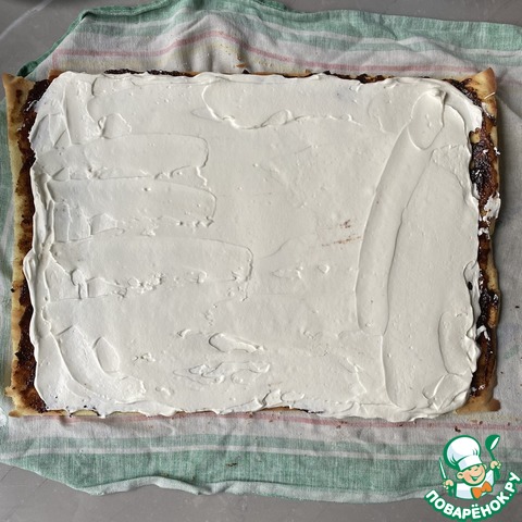 Сверху распределить крем-чиз так, чтобы более высокий слой был с той стороны, откуда рулет начнете скручивать и тоньше - в конце рулета.