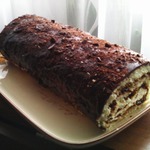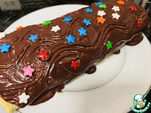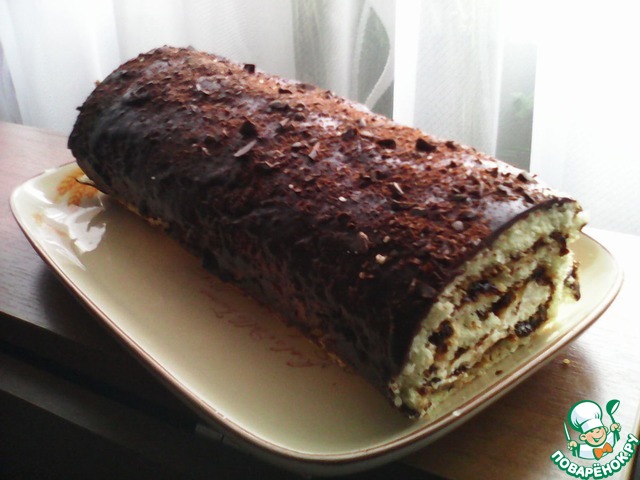 Для покрытия рулета подогреть сливки до кипения и вылить на измельченный шоколад. Добавить коньяк и все хорошо перемешать до полного объединения (однородной эмульсии). Покрыть рулет, когда глазурь начнет густеть, но будет еще текучей. Оставить для стабилизации.