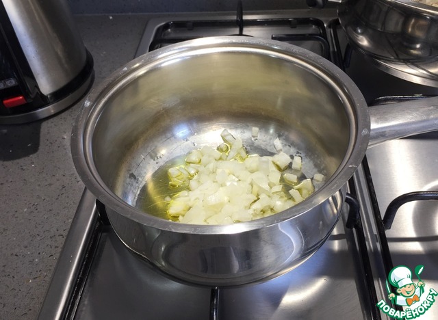 В кастрюлю наливаем оливковое масло, всыпаем лук. Жарим до румяности на среднем огне. Это займет примерно 2-3 минуты.