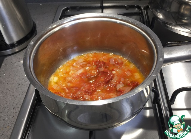 К луку добавляем томатную и перечную пасту, перемешиваем и тушим еще 2-3 минутки.