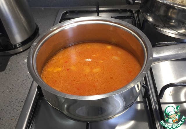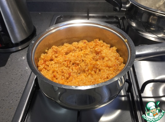 В кастрюлю всыпаем булгур, заливаем водой и перемешиваем. Готовим 15-20 минут на среднем огне.