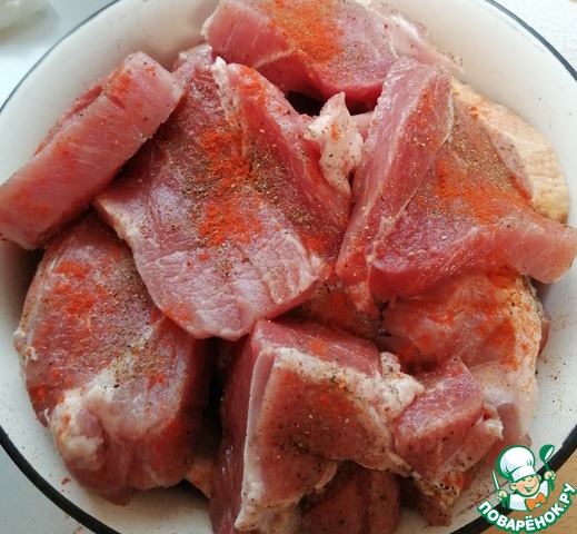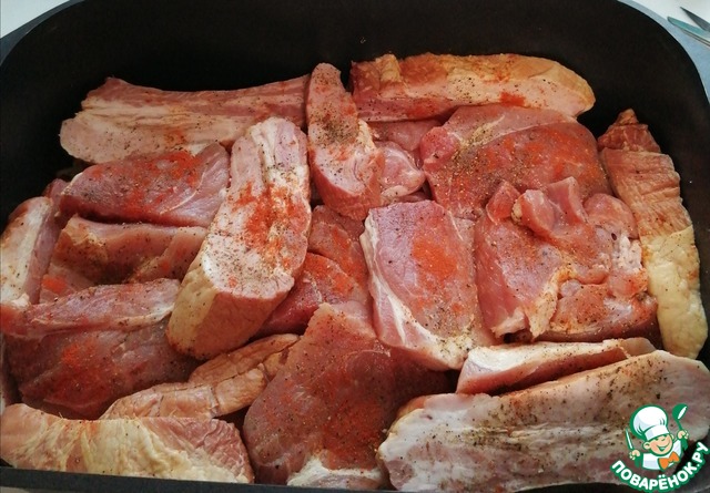 Мясо нарезать крупными кусками, присолить, помня что у нас квашеная капуста солёная. Поперчить чёрным перцем и паприкой. -