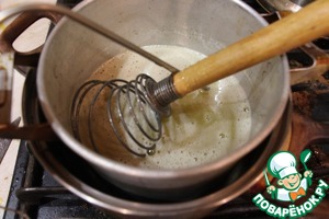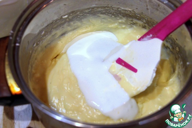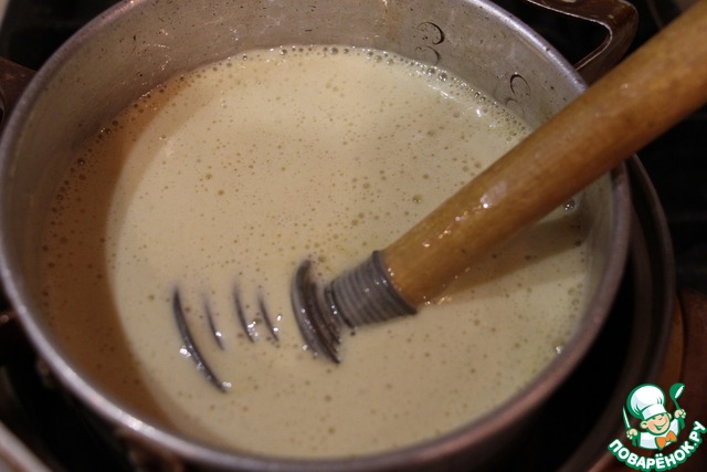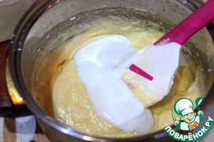 Далее готовим сметанный мусс. Замочить желатин в 25г холодной воды. Перемешать сахар с крахмалом. В сотейник выложить яйцо со сметаной и начинаем прогревать, помешивая.