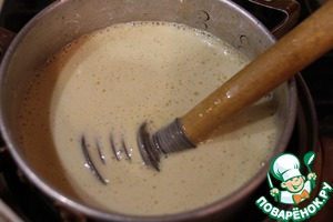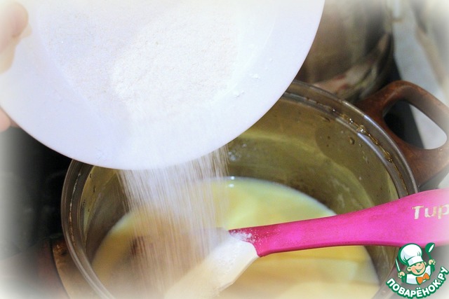 Потихоньку дождиком вводим туда крахмал с сахаром и варим до загущения (до 80°). Снимаем с плиты и вмешиваем желатин.