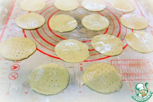 Далее тонко раскатываем тесто. вырезаем кружочки на 1 см меньше формы. Выкладываем их на силиконовый коврик, протыкаем вилкой.