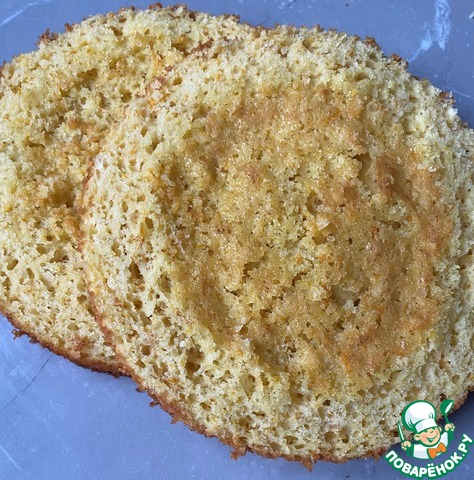 Разрезать на два коржа. Пропитать их сиропом (соединить сок и сахар, довести до кипения и проварить 2 мин)