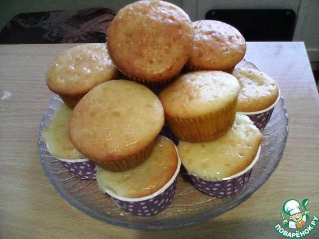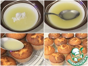 Готовые кексики остудить 10 минут, не вынимая из формы, затем переложить на решетку, наколоть зубочисткой и пропитать приготовленным сиропом.