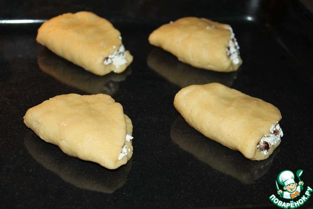 Каждую часть теста раскатываем в овал ( шарик-колбаска-сплющ енная колбаска). На половину овала укладываем 1/6 часть начинки и накрываем сверху второй половиной теста, слегка прижав (начинку в чашке нужно максимально уплотнить ложкой). Выкладываем на смазанный маслом противень или бумагу.