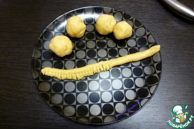 Разделить тесто на кусочки, размером с грецкий орех. У меня получилось 9 штук. Каждый кусочек раскатать в жгут, длиной примерно 12-15 см. Ножом сделать насечки от середины жгута.