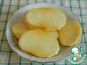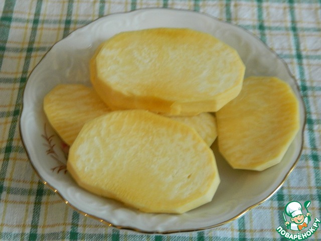 Репу почистим, нарежем кольцами, зальем кипятком на 5 минут, потом отварим в течении 10 минут.