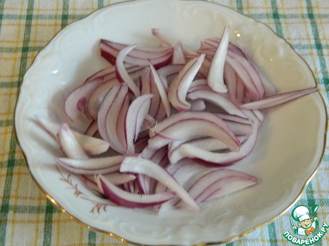 Лук очистим от шелухи. Фиолетовый лук сладкий на вкус, он совсем не горчит и не требует дополнительной обработки.