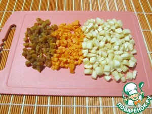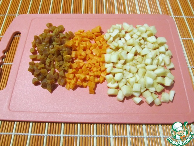 Куруму, морковь, яблоко порезать мелкими кубиками.