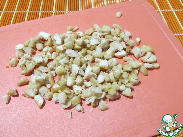 Филе обжарить на сковороде в 1 ст. л растительного масла. Затем порезать на более мелкие кубики.