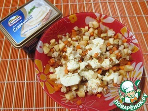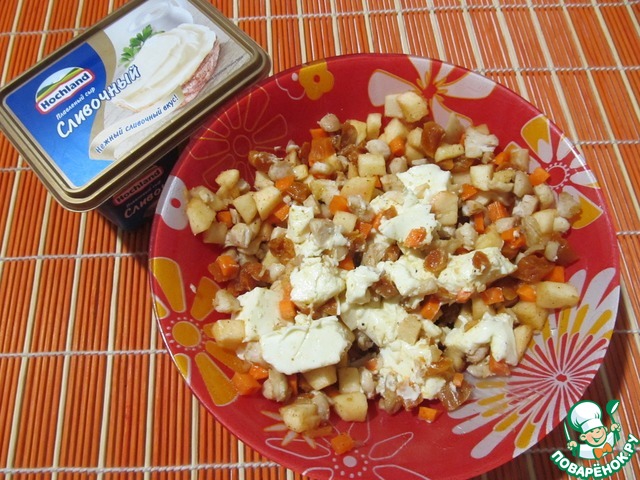 Смешать курагу, морковь, яблоки, филе. Добавить сыр, измельченный чеснок, специи, посолить и перемешать.