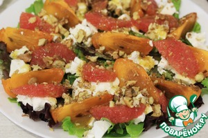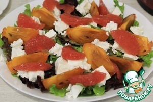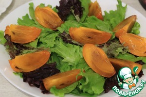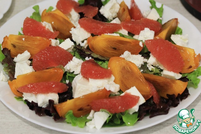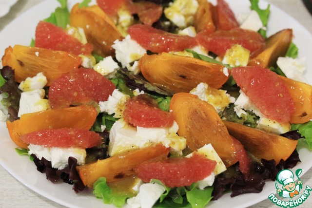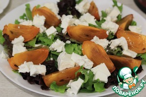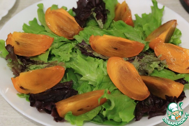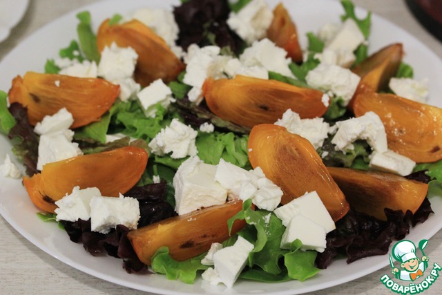 Легкий салат с нежной сладкой хурмой и солеными кубиками феты – прекрасное дополнение к бокалу вина.