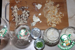 Послойно раскладываем соответствующие компоненты и декор. Помним: пузатые бокалы гораздо вместительнее конических. Элементы присыпки скатываем по стеклу в нужное место, слои очень аккуратно уплотняем. -