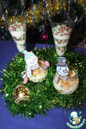 Для подачи решила разделить снеговиков (сыр-крем-крекер) и ёлок (глазированные вафли-крем). Украшения - кондитерская посыпка, шарики для пуговиц, картонные фигурки. Подача в пузатых и конических бокалах.
