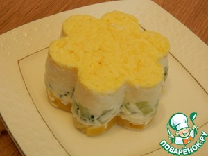 У меня есть формочка в виде цветка, пришло время ее опробовать и приготовить порционный салат. Мне, кажется получилось совсем неплохо. И красиво смотрится на столе.