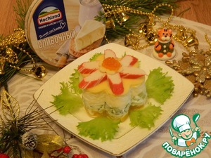 На сыр уложем красиво порезанные вдоль крабовые палочки. В центр тоже вырежем маленький цветок из сыра, у меня нашлась анологичная форма, но маленькая. Уложем ее по центру.