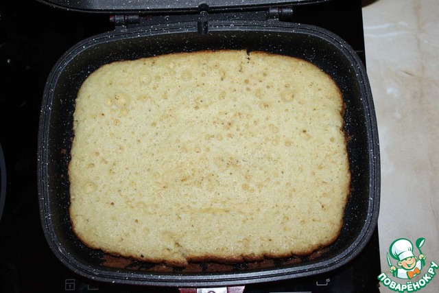 Смешиваем компоненты бисквита, пока мешаем - разогреваем крышку от двухсторонней сковороды Redmond. Смазываем нижнюю часть сковороды, выливаем готовое тесто, закрываем и на среднем огне выпекаем 7-10 минут. На 10 минутах нижняя сторона подрумянивается.
