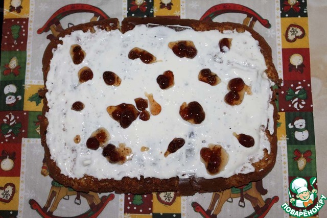 Готовый бисквит укладываем на салфетку, смазываем верх коржа сметаной, добавляем земляничное варенье, при помощи салфетки закатываем в рулет, убираем на холод и готовим глазурь.