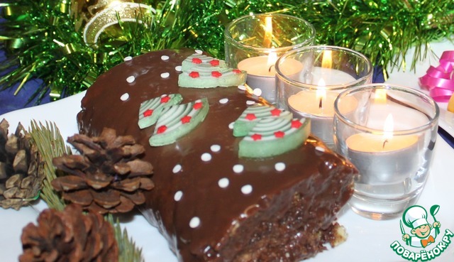 Готовую глазурь убираем в сторону, нарезаем мармеладный рулет дольками и секторами, выкраивая ёлочку, которую затем украшаем кондитерской посыпкой (звезды).