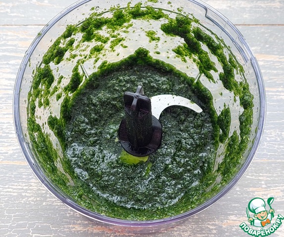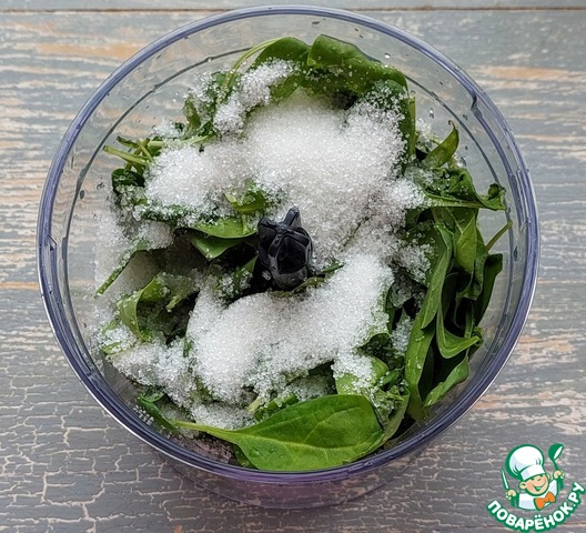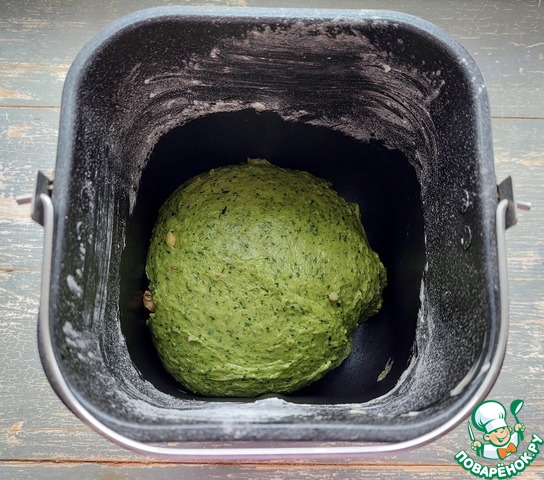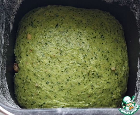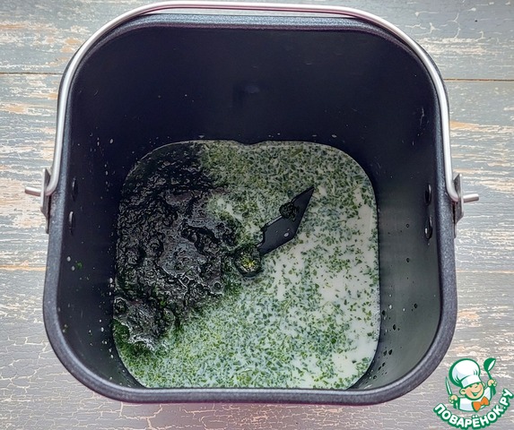 Тесто я буду замешивать в хлебопечке. В ведёрко хлебопечки переложить шпинатную массу, добавить теплое молоко, соль.