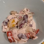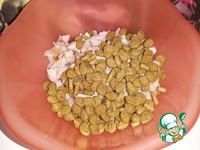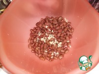 Фасоль промыть фильтрованной водой и откинуть на дуршлаг. Выложить в салатник, добавить измельчённый чеснок.