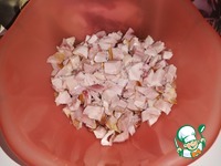С окорочка убрать кожицу и кости. Мясо нарезать немелкими кусочками.