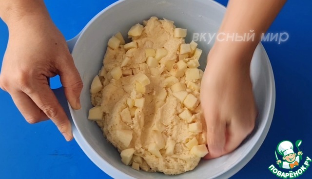 К творогу добавить яйцо, сахар и перемешать. Можно пробить блендером, но я этого не стало делать. Добавить растительное масло (можно и сливочное масло), еще раз перемешать. Всыпать частями муку, разрыхлитель, замесить однородное, мягкое тесто. Тесто должно быть не слишком тугим, но держащим форму, немного липким. Количество муки зависит от влажности творога, поэтому ее может понадобиться больше или меньше. Затем добавляем яблоки, нарезанные на кубики, по желанию можно добавить изюм.