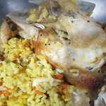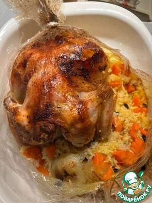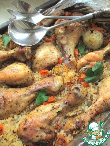 Я ещё добавила маленькие помидорки к рису и в курицу тоже вместе с зайчиком чеснока положила, побольше моркови кубиками, приправы и 3 стакана воды.