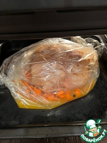 Добавляем королеву вечера, завязываем рукав и отправляем в духовку при температуре 180 градусов на 1 час 30 минут