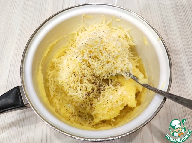 Сыр (50 гр.) натереть на мелкой терке, добавить в картофельное пюре