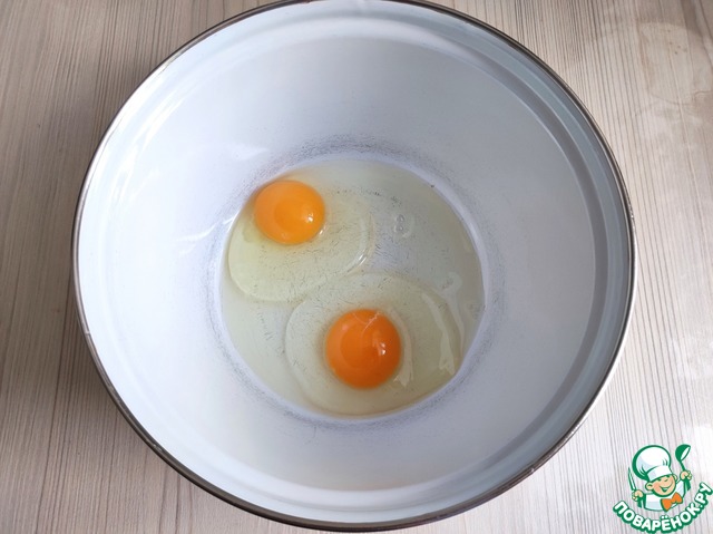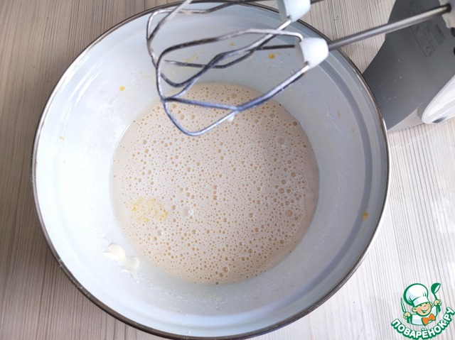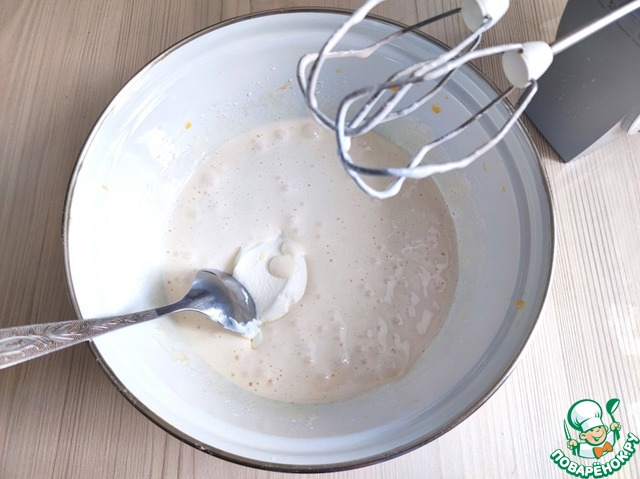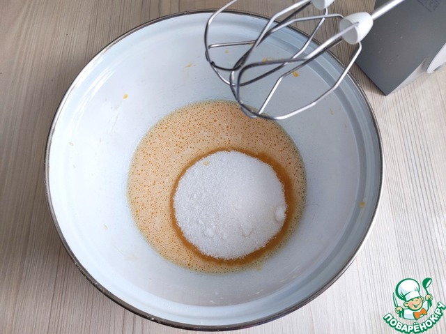 Добавить 150 гр. сахара. Взбить смесь до бела.