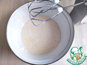Сливочное масло (60 гр.) растопить и немного остудить, добавить в яично-сахарную смесь. Смесь взбить.