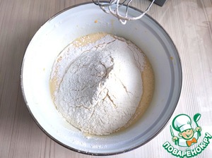 Разрыхлитель (10 гр.), ванилин (1/2 ч. ложки) смешать с просеянной мукой (350 гр.). Сухие ингредиенты добавить в яично-сахарную смесь. Замесить мягкое тесто. Тесто накрыть пищевой пленкой и оставить на 20-30 мин.
