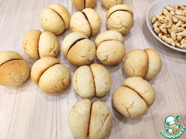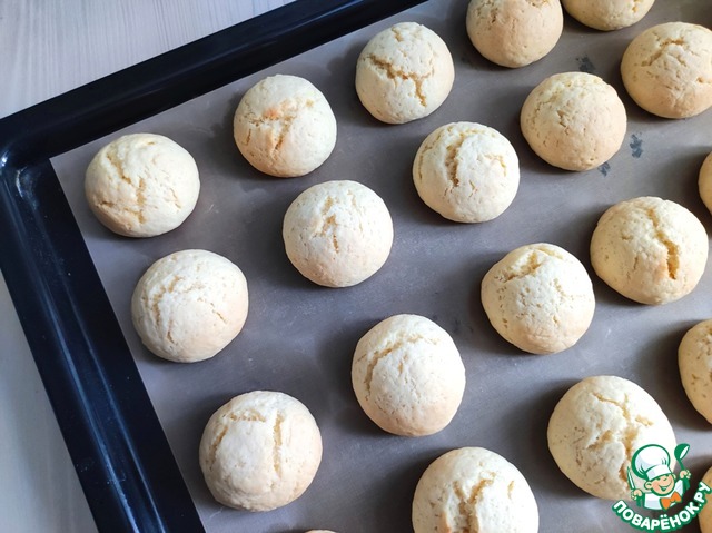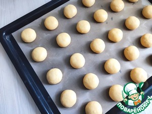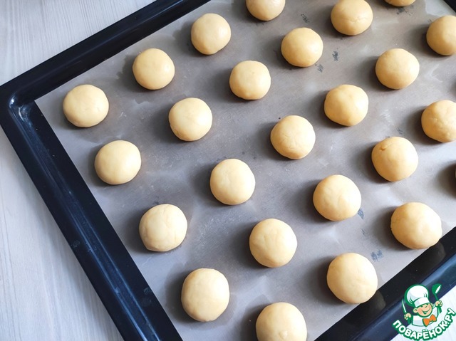 Далее сформовать шарики чуть больше грецкого ореха. Выложить тесто на противень застеленный пергаментом и слегка приплюснуть. Противень с заготовками отправить в разогретый до t180С духовой шкаф. Выпекать в течение 12-15 мин.