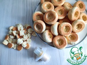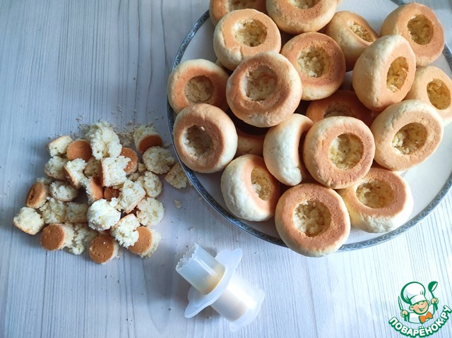 Пока заготовки для будущих пирожных теплые, вынуть серединки у заготовок при помощи ножа, чайной ложки или специального приспособления.