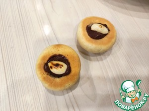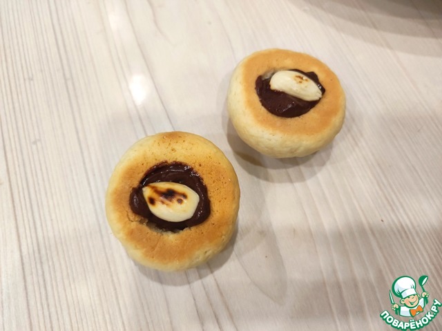 Заполнить углубления в пирожных шоколадным кремом, добавить в каждую заготовку миндаль.