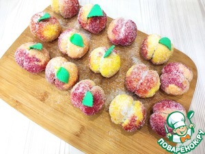 Заготовки покрыть морковным, затем свекольным соком и прокатать в сахарном песке. В качестве декора были приготовлены листочки из сахарной мастики.