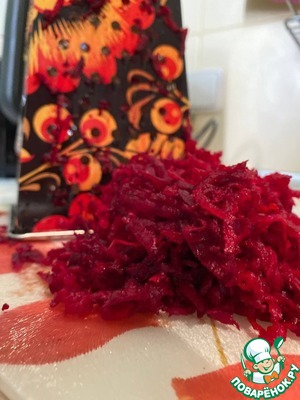 Добавляем в нашу зажарку томатную пасту, помидоры, воду, после того, как всё немного протушиться, добавляем свеклу.