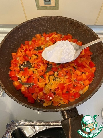 Ставим сковороду, наливаем подсолнечное масло, добавляем лук, морковку и болгарский перец. Очень важно: вместо муки мы добавляем столовую ложку крахмала, благодаря чему мы получим идеальную консистенцию и хороший навар. Крахмал поможет более ярко раскрыть вкусы всех ингредиентов.