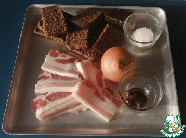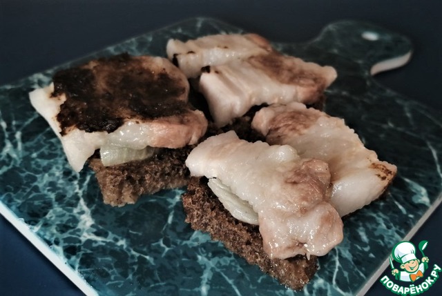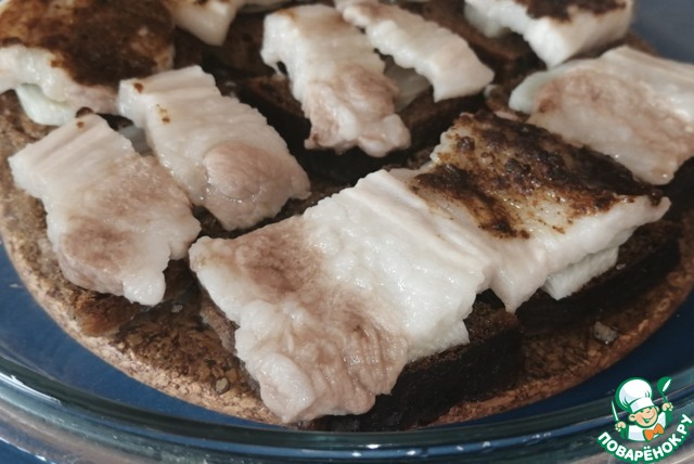 Грудинку порезать на кусочки толщиной 5-7 мм, хлеб - на 9 четвертинок. -