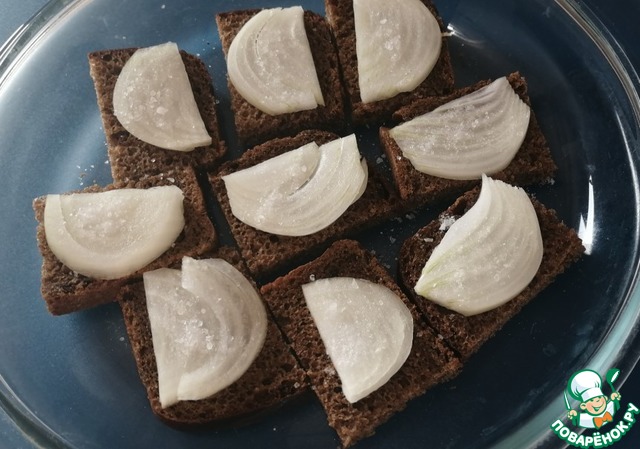 Хлеб положить на блюдо, на хлеб - лук, посыпать солью.