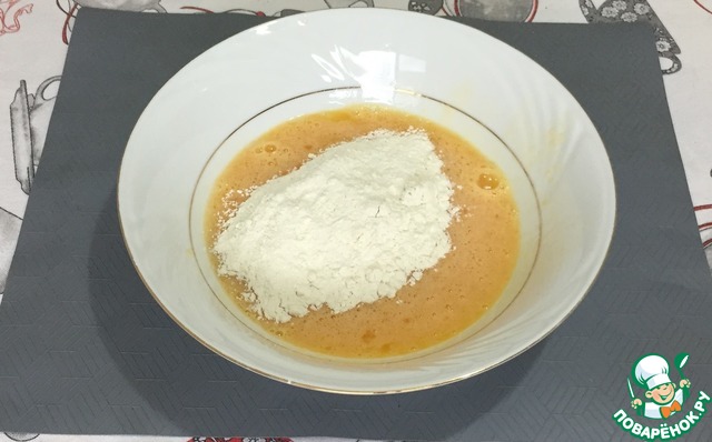 Далее добавляем разрыхлитель и муку и снова перемешиваем