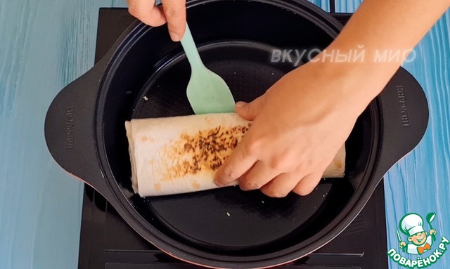 Потом аккуратно сворачиваем в рулет. Жарим на сухой сковороде с двух сторон до корочки.