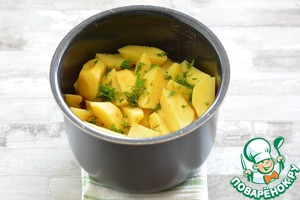 Сверху выложите картофель, тоже слегка подсолите его, влейте воду. Примерно 500-700 мл, чтобы рёбра были полностью покрыты водой, а картофель нет.