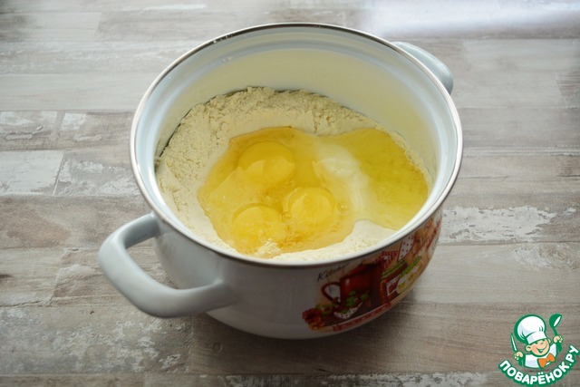 Сюда же разбейте 3 яйца и начните постепенно вливать молоко, размешивая тесто венчиком, чтобы не было комков (или смешивая миксером на малых оборотах). Оставьте тесто на 15-20 минут, чтобы мука набухла. Тесто по густоте должно быть как кефир.