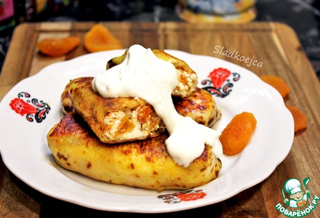 Классический рецепт блинчиков с творожной начинкой. Вместо кураги можно добавить изюм