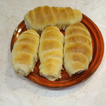 2. Как только тесто увеличиться, достаем его, немного проминаем, раскатываем в колбаску и делим на 10 частей. Формируем круглые лепешки. Скалкой раскатываем лепешку и кладем в центр сосиску. Делаем по бокам надрезы и плетем косичку. Противень застелим пекарской бумагой и смажем ее растительным маслом. Выкладываем сосиски в тесте на противень и смазываем их желтком.